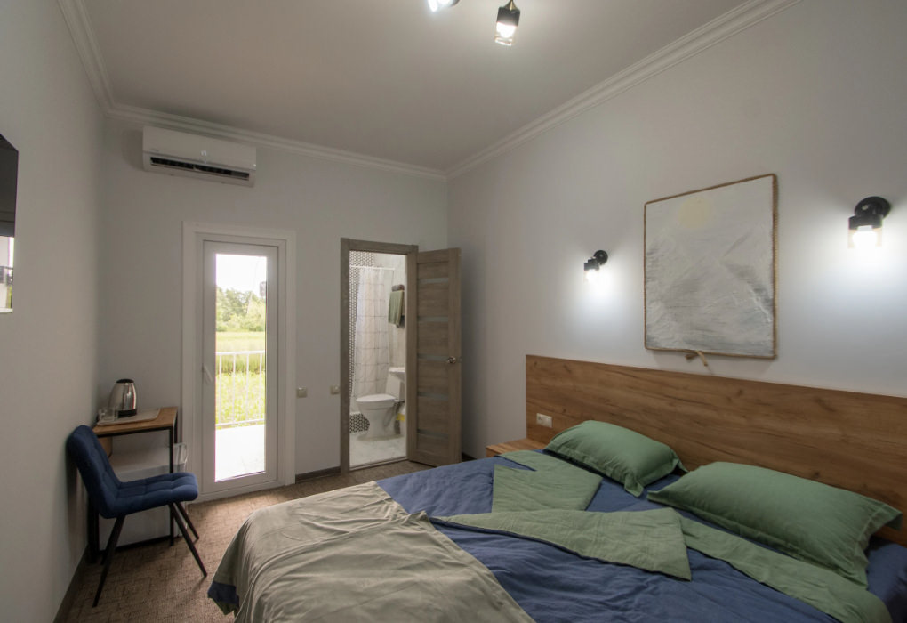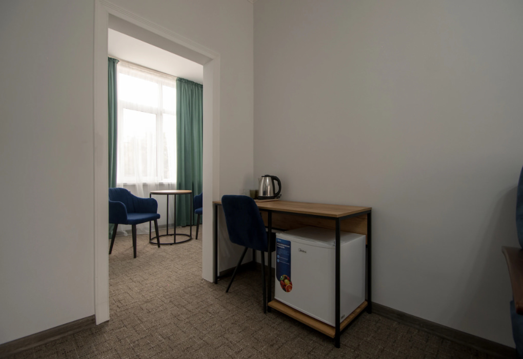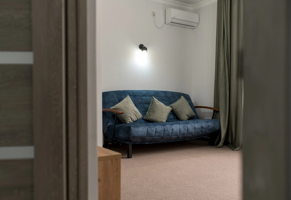 Площадь номера - 55 кв.м. 2 комнаты. 2 осн. места. гостиная с оборудованной кухонной зоной, в которой имеются диван-кровать, кресла и камин, спальня с 2-спальной кроватью, имеется межкомнатная дверь. В номере: телевизор; холодильник; кондиционер; душ; туалет; фен; мини-бар; сейф; халаты; Wi-Fi; СВЧ печь; стиральная машина; 2-спальная кровать; чайник; газовая плита; кухня; диван-кровать. 2 доп. места: Диван-кровать - может быть установлен без ограничений по возрасту (входит в стоимость номера).